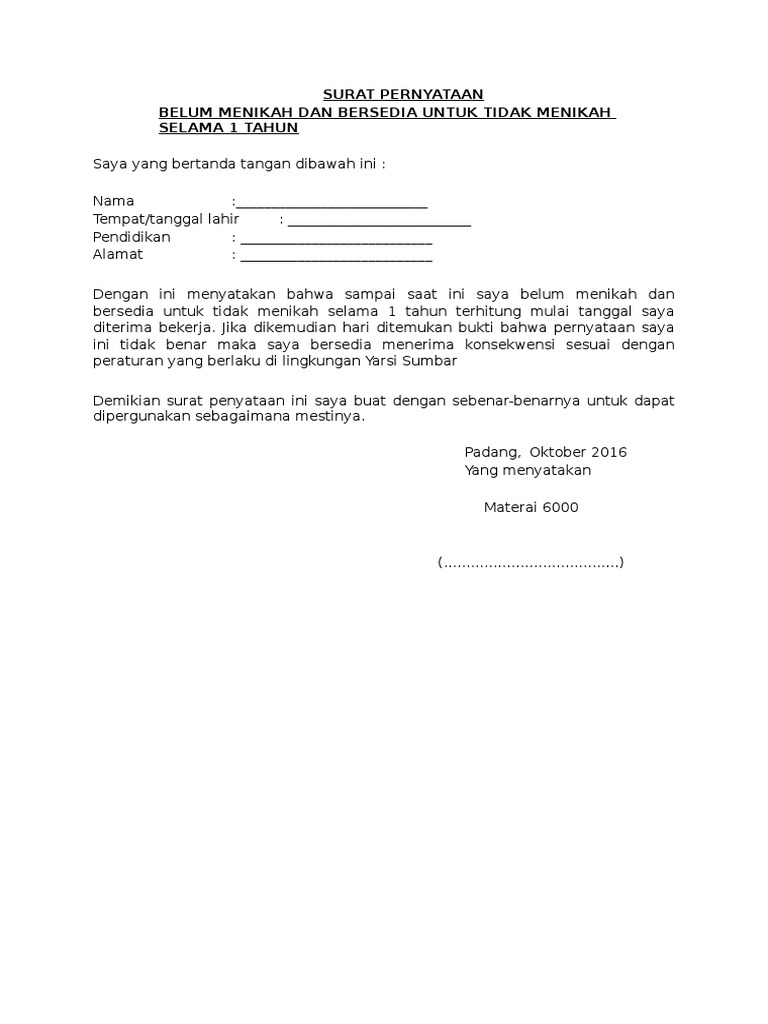 Nah, penulisan surat pernyataan belum menikah ini sangatlah mudah dan tidak jauh berbeda dengan penulisan surat pernyataan lainnya. Lanta, 31 oktober 1991 demikian surat pernyataan ini dibuat dalam keadaan sadar dan tidak ada tekanan dari pihak lain untuk dipergunakan sebagaimana mestinya. Buatlah contoh surat pernyataan bersedia tidak menikah selama menjadi peserta magang jasa raharja.buatlah contoh iklan eksposisi yang dapat di manfaatkan untuk mempromosikan barang dan jasa pertandingan. Hanya saja penggunaan bahasanya harus sopan dan penulisan suratnya harus sesuai dengan ejaan yang disempurnakan. Dibawah ini contoh surat pernyataan belum menikah, yang bisa digunakan untuk berbagai macam keperluan.